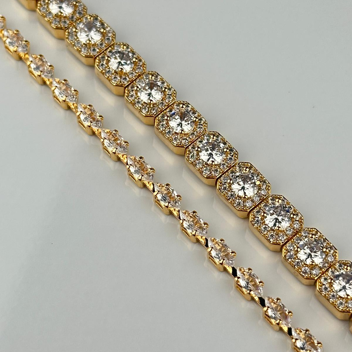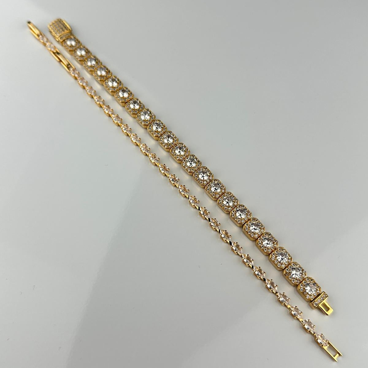 Verleihe deinem Look einen Hauch von Luxus mit unserem exklusiven Schmuck-Bundle aus zwei goldfarbenen Armbändern. Die funkelnden AAA Zirkonsteine sorgen für ein edles Strahlen und machen dieses Set zum perfekten Begleiter für Alltag und besondere Anlässe.